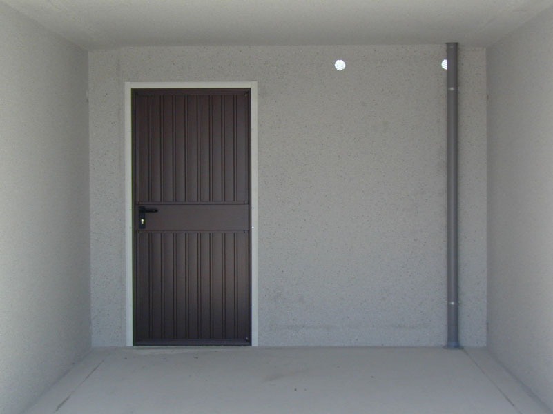 Extérieur : crépi fin blanc. D'autres couleurs sont disponibles sur demande. Intérieur : peinture grise mouchetée et protections latérales pour les portes.